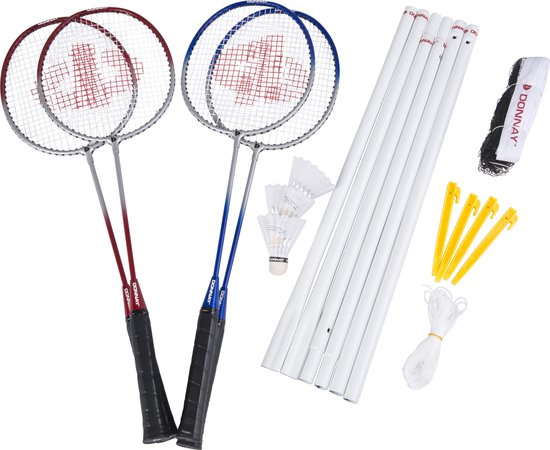 De Donnay badmintonset is perfect voor recreatief gebruik. De set wordt geleverd in een handige tas en bevat vier rackets, een net en drie shuttles. De shuttles zijn gemaakt van duurzame materialen en zijn qua kleur afgestemd op de rackets. De set is verkrijgbaar in vier kleuren: rood, blauw, zilver en wit.