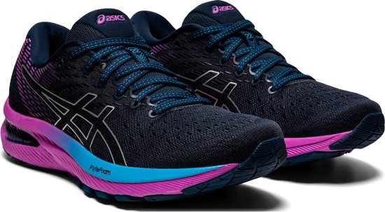 De ASICS Gel Cumulus 22 Hardloopschoenen Dames - Maat 39,5 zijn ontworpen om een combinatie van bounce en demping te bieden, met een Fluidride tussenzool en ComforDry Sockliner. De schoenen hebben ook een Stability EVA Trusstic tussenzool ondersteuningssysteem en een buitenzool van slijtvast AHAR+ rubber. Het navy - blauw - paarse kleurenschema is perfect voor elke loper, en de constructie van synthetisch materiaal - textiel - rubber zorgt ervoor dat deze schoenen zelfs de zwaarste trainingen aankunnen.