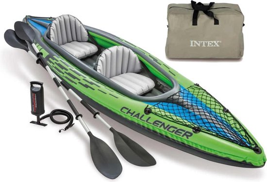 Zoek je een opblaasbare kajak die perfect is voor een recreatieve tocht op de vijver of een rustig meer? Zoek niet verder dan de Intex Challenger K2! Deze kajak is gemaakt van sterk vinyl voor duurzaamheid, en heeft twee verstelbare opblaasbare zittingen met rugleuningen voor comfort. De opblaasbare bodem zorgt voor extra comfort, terwijl de verwijderbare skeg aan de onderkant bijdraagt aan de richtingsstabiliteit van de kajak. Het laadnet biedt opbergruimte voor je spullen en andere zaken. Het grijpkoord aan beide uiteinden maakt het gemakkelijk om de kajak in het water vast te pakken, of om hem te vervoeren. levering omvat 1 opblaasbare kajak, 2 aluminium peddels, 1 pomp, 1 reparatieset en 1 opbergtas.