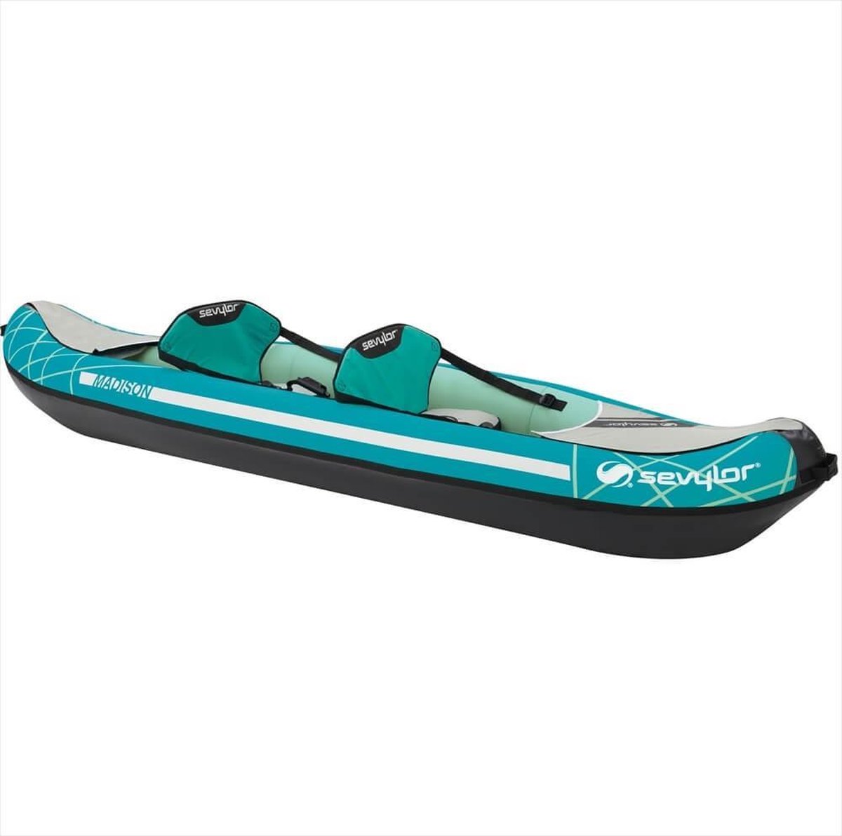 De Sevylor- 2-Persoons Opblaasbare Kajak - Madison - 330 x 94cm is de perfecte keuze voor wie van watersport houdt. Hij is gemaakt van hoogwaardige materialen en beschikt over zitplaatsen met een extra hoge rugleuning en comfortabele handgrepen. Je kunt deze 2-persoons kajak ook gemakkelijk ombouwen tot een 1-persoons kajak. De kajak heeft een maximaal draaggewicht van 210 kg en is gemakkelijk te vervoeren dankzij de handige handgrepen. Het bevat ook een verbeterde draagtas.