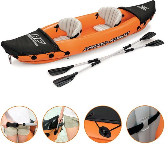 De Hydro Force Ventura X2 opblaasbare kajak is de perfecte manier om met een vriend of geliefde te genieten van een dagje op het water. Deze sportieve kajak heeft een opblaasbare bodem van zwaar PVC voor een stevige en betrouwbare rit, en is uitgerust met twee verstelbare zittingen met opbergvakken, een apart opbergvak, en een gecoate nylon hoes die bestand is tegen zon, olie en zeewater. De Ventura bevat ook een verwijderbare vin en reparatiepleister, en wordt geleverd met twee peddels van 218 cm en een handpomp. Met een maximaal gewicht van 200 kg is deze kajak perfect om te genieten van een ontspannen dagje op het water.