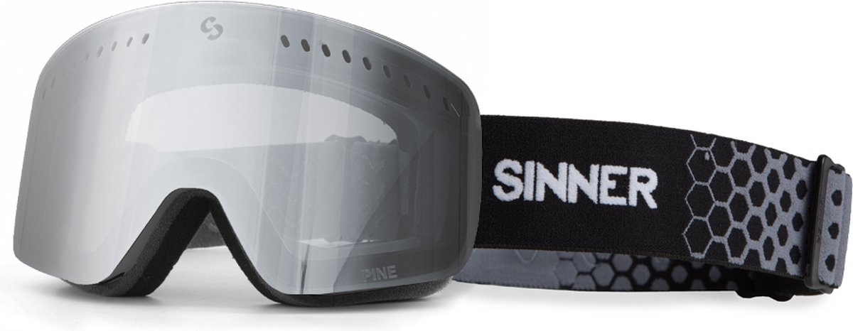 De SINNER PINE is een skibril/snowboardbril zonder fysiek frame. De grijze spiegellens (Categorie 3) is geschikt voor zeer zonnige omstandigheden, vermindert verblinding en biedt 100% UV-bescherming. De dubblelens heeft een speciale anti-condenslaag aan de binnenkant en ventilatiekanalen in de lens, waardoor de kans op condensatie aan de binnenkant van de lens aanzienlijk vermindert. Het hypoallergene schuim rond het frame voorkomt vervelende drukpunten op het gezicht en is gemaakt van anti-allergisch materiaal. De verstelbare, elastische band is voorzien van siliconen zodat deze goed op de helm blijft zitten.