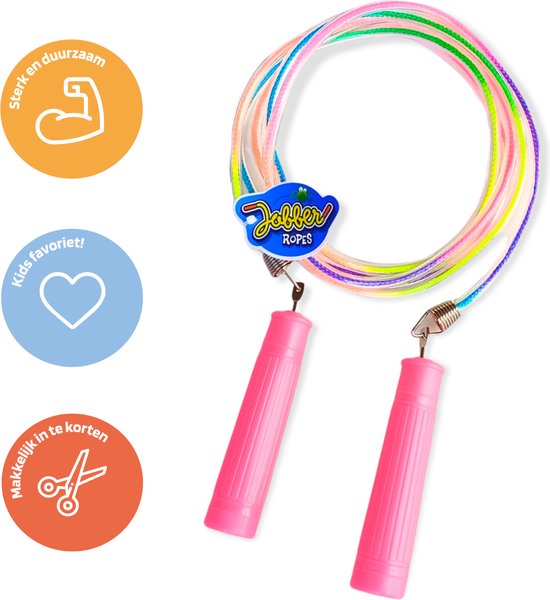 Maak kennis met het Jobber Toys Springtouw Kinderen - Regenboog! Dit heldere en kleurrijke springtouw is perfect voor kinderen van alle leeftijden. Het is gemaakt van duurzame materialen en is in lengte verstelbaar, zodat het met je kind mee kan groeien. Het regenboog motief tovert vast een glimlach op hun gezicht, en het Eenhoorn figuurtje op het handvat is een extra bonus! Dit springtouw zal je kind zeker uren speelplezier en beweging bezorgen.