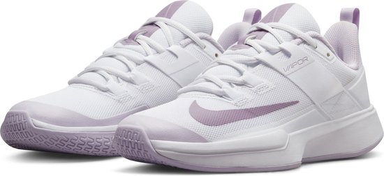 Maak kennis met de Nike Court Vapor Lite sportschoen voor dames, je nieuwe go-to voor hardcourt dominantie. Deze schoen is geschikt voor voeten met een normale breedte en wordt geleverd met vetersluiting en een speciale band aan de binnenkant die je voet op vier punten op zijn plaats houdt tijdens intense bewegingen, geïnspireerd op een veiligheidsgordel. Je geniet van uitzonderlijke demping van de schuimrubberen tussenzool, die zachter schuim biedt bij de voetboog en harder schuim aan de buitenkant voor gerichter afzetten en soepel lopen. Er is ook een uitneembare EVA-inlegzool voor nog meer comfort. De slijtvaste rubberen buitenzool geeft je de grip en tractie die je nodig hebt om optimaal te presteren, terwijl het witte en paarse kleurenschema je scherp houdt. Dus houd je niet in - pak een paar Nike Court Vapor Lite Damessportschoenen en breng je spel naar een hoger niveau.
